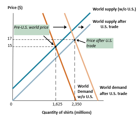 - when the U.S. moves from autarky to free trade, the world demand curve shifts to the right because U.S. consumers have entered the market