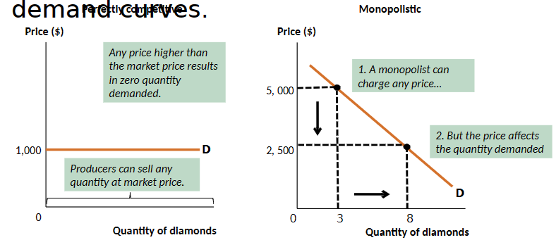 Monopolies differ from perfectly competitive firms with regard to their demand curves.