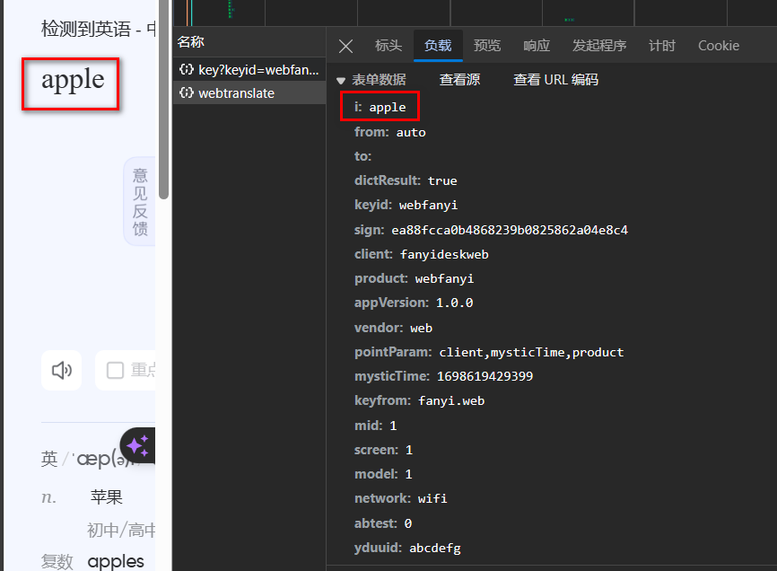 随便在有道翻译上输入一个单词,再在网络选项卡里翻找,你会发现有一个请求是这样的: