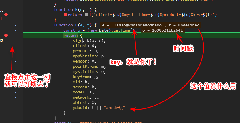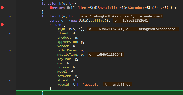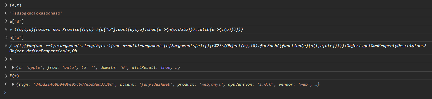 相当于在 k 函数中,会生成这么一个字符串:client=fanyideskweb&mysticTime=${t}&product=webfanyi&key=fsdsogkndfokasodnaso,仅有时间戳是动态,我们无脑塞时间戳就完事了。