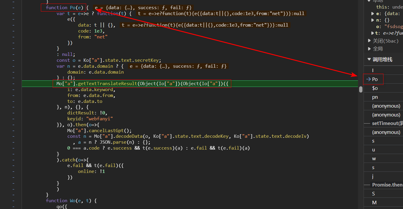 刚才提到的 a["d"] 所返回的 Promise 对象去了此处的 Mo["a"].getTextTranslateResult(),服务器成功响应,走到 then,也就是我们解密的关键:有道翻译客户端对这个响应做了什么处理?