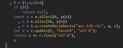 t、o、n三个参数,分别代表了 base64 编码后的数据、用于解密的 key 和用于解密的 iv