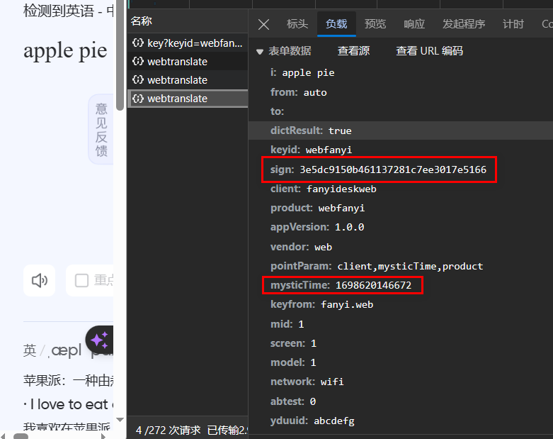 重新来看该请求的表单数据,参数 i 顾名思义便是我们输入的单词的明文,而参数 mysticTime 一眼就能看出是一个时间戳。我们可以此时再输入一个单词,来看看表单数据的哪些参数是不变的、哪些是变化的。