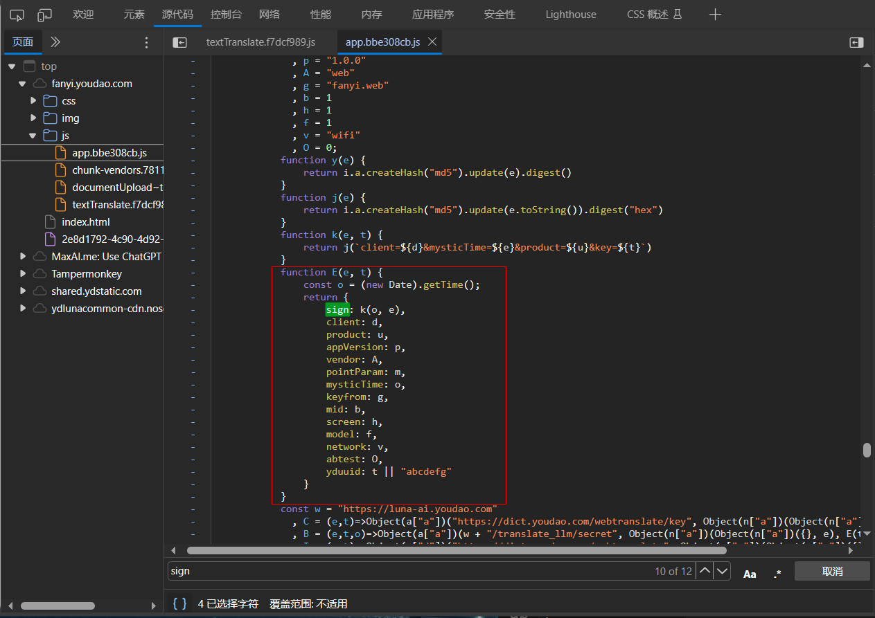 既然客户端需要发送请求给服务器,那自然就需要一个加密算法来加密 sign、便于服务器解密。我们可以在网页开发者工具中找到这个加密算法。有道翻译还是很厚道的,一搜索「sign」这个字眼就能找到客户端封装表单数据的函数: