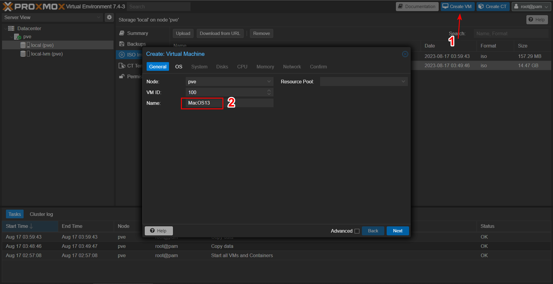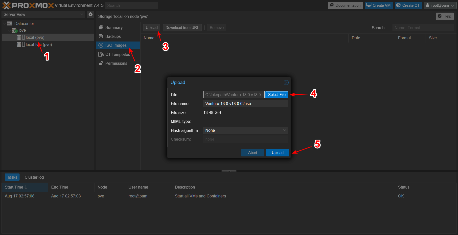 打开节点的 local 存储空间后点击 ISO Images > Upload > 找到 MacOS ISO 文件 > Upload。