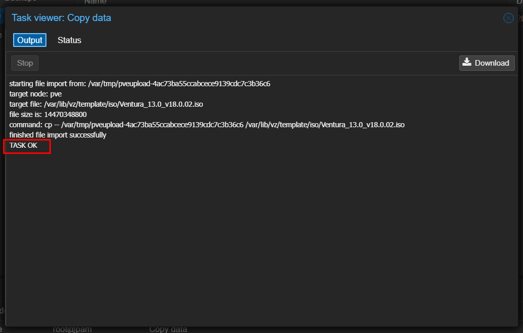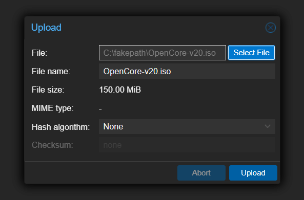 使用和 MacOS ISO 文件一样的方法将其上传到 Proxmox VE。