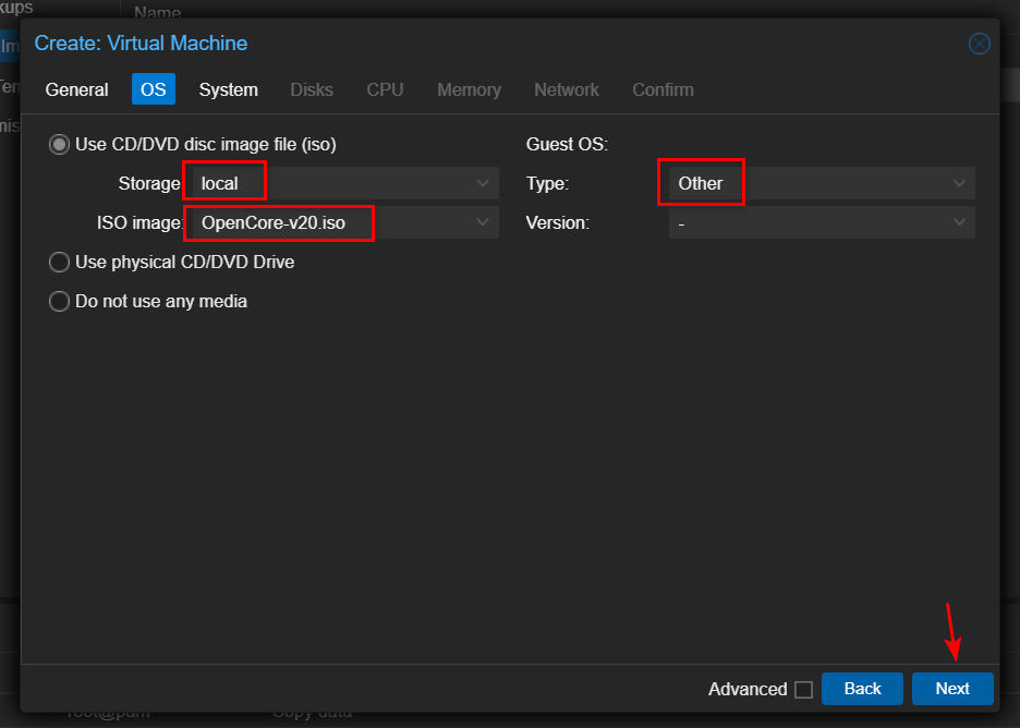 - 在 ISO image 一栏选择 OpenCore-v20.iso