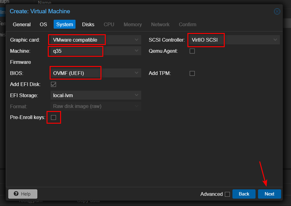 - 在 EFI Storage 一栏选择 local-lvm