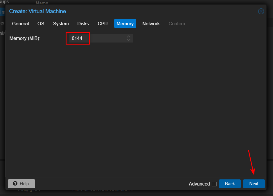 点击 Memory 页面。至少也需要 4GB 的内存,我输入了 6GB。