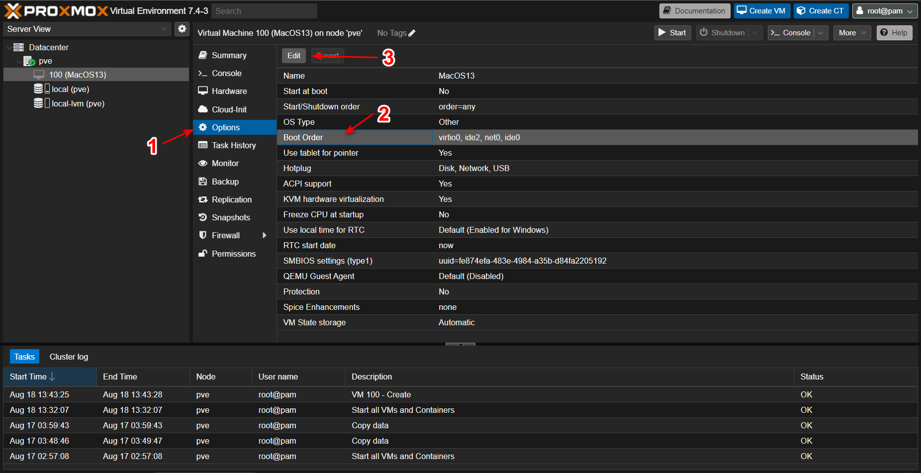选择 Options,选中 Boot Order 后点击上方的 Edit 来修改虚拟机的 Boot 顺序。
