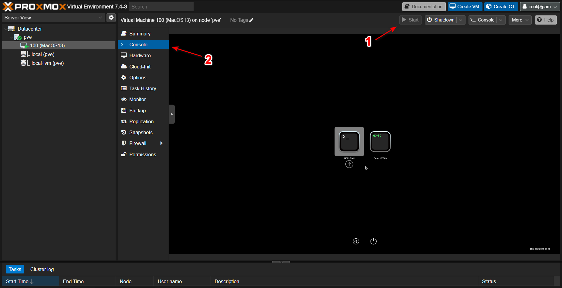 回到 Mac 虚拟机,点击右上方的 Start 启动虚拟机,然后选中左侧的 Console。