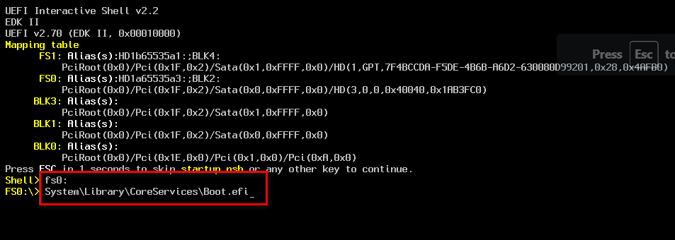 回车进入 UEFI Interface Shell,输入以下命令: