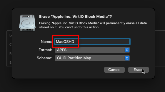 修改硬盘的名称,点击 Erase。